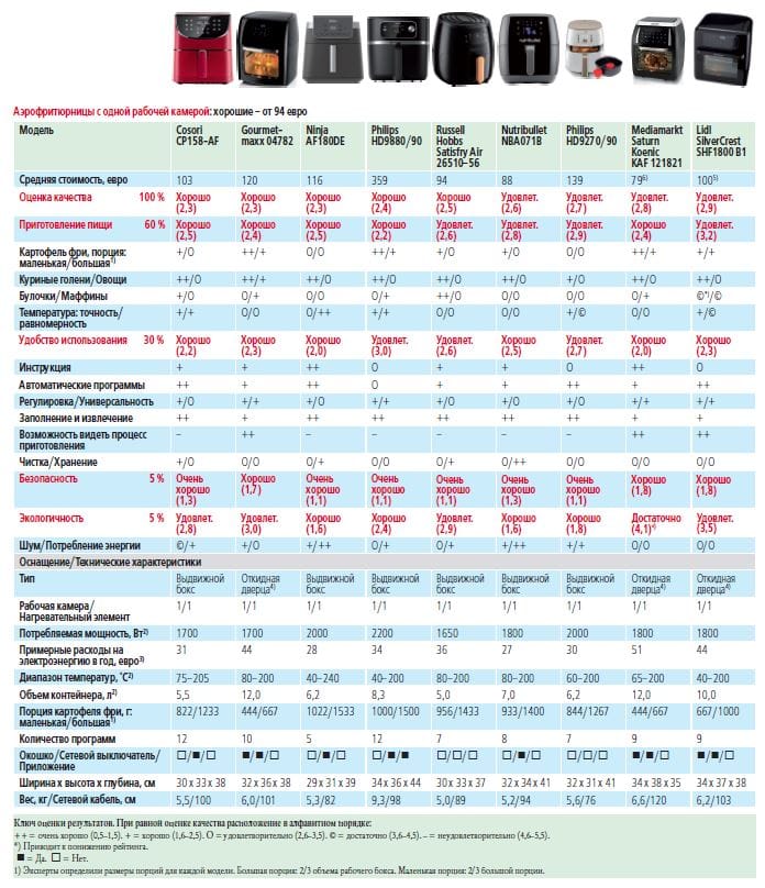 Шесть аэрофритюрниц показали хорошие результаты, все остальные – удовлетворительные. Лучшими эксперты признали четыре модели: Cosori (103 евро), Gourmetmaxx (120 евро), Ninja (116 евро) с одной рабочей камерой и Cosori (177 евро) с двумя отделениями. Равномерность приготовления продуктов у всех моделей сильно отличается. В самом важном аспекте проверки – собственно, приготовлении пищи – тестируемые образцы получили хорошие и удовлетворительные оценки.