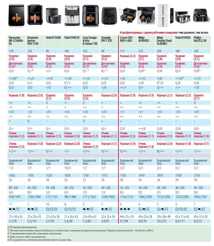 А будут ли картофель фри, куриные крылышки или голени такими же хрустящими, как приготовленные во фритюре традиционным способом? Получатся ли маффины такими же вкусными и румяными, как из духовки? Эксперты протестировали 20 аэрофритюрниц по цене от 79 до 359 евро. Пять из этих приборов оснащены двумя рабочими камерами, остальные – одной. Среди устройств с одной емкостью три оборудованы откидной дверцей, как в духовке, а не выдвижным боксом.
