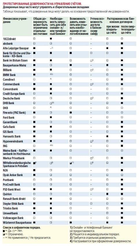 Эксперты решили узнать, какие доверенности предлагают банки, и существуют ли между ними различия. Каждая кредитная организация и строительная сберегательная касса использует собственный бланк доверенности. В таблице ниже приведены 38 банков и показано, что разрешено и что запрещено доверенному лицу. Эксперты изучили кредитные организации и порталы, представленные в сравнении ставок по сберегательным счетам, а также отдельные онлайн (Direkt-), нео- (Neo-) и крупные банки.