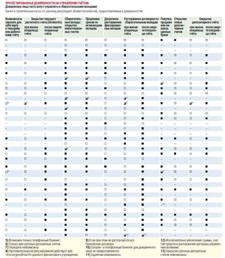 Только банк Mittelbrandenburgische Sparkasse в Потсдаме дополнительно предлагает универсальную доверенность («Konto-/Depot-/SchrankfachvollmachtVorsorgevollmacht»), которая позволяет доверенному лицу получить доступ, в том числе, к банковскому сейфу.