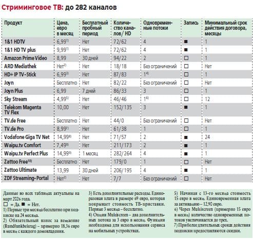Для потокового телевещания эксклюзивные права играют менее важную роль. Многие нишевые каналы доступны только через определенные сервисы, но самые крупные, такие как ARD, ZDF, RTL и региональные общественные вещатели, включены почти во все пакеты представленного телегида. Количество каналов существенно варьируется: от 7 до 282. Точное число может измениться в любой момент, например из-за добавления новых каналов или удаления ранее включенных.