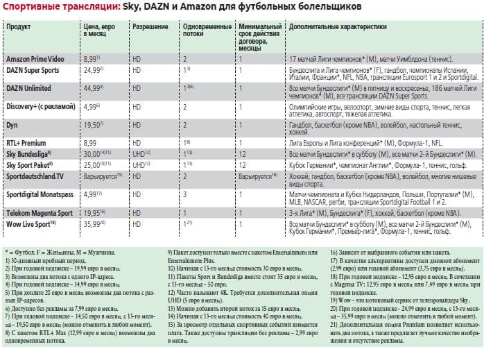 В спортивном стриминге ключевой фактор – эксклюзивные права. Из-за этого у футбольных болельщиков нередко возникают трудности. Например, чтобы смотреть матчи Бундеслиги, Кубка Германии и Лиги чемпионов, часто требуется несколько подписок, в частности на Sky и DAZN, тогда как отдельные матчи доступны через Amazon. Права распределены между разными вещателями.