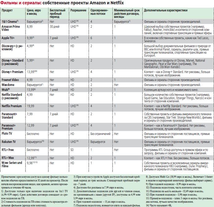 В Германии насчитывается примерно 22 млн активных подписчиков стриминговых сервисов. Благодаря фиксированным тарифам пользователи могут смотреть сколько угодно контента за 5–45 евро в месяц (зависит от типа подписки, наполнения и дополнительных функций). Фильмотеки у разных провайдеров существенно различаются в основном из-за эксклюзивных прав.