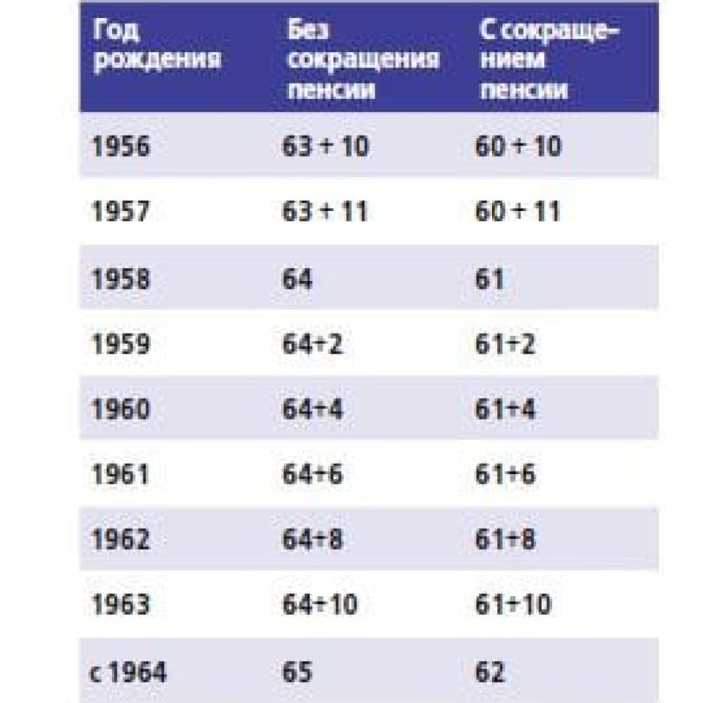 В таблице ниже мы во втором столбце привели возраст (годы + месяцы), в котором инвалиды указанного слева года рождения имеют право выйти на пенсию без её сокращения, а в третьем столбце – возраст, начиная с которого возможно досрочное получение пенсии по инвалидности на условиях её сокращения.