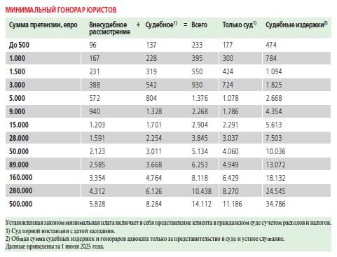 При поиске адвоката потенциальная стоимость иска имеет очень большое значение. Чем меньшую сумму рассчитывает получить клиент, тем меньшее желание юриста браться за это дело. При исковых требованиях до 500 евро средний гонорар адвоката составляет 187 евро без НДС. При этом его работа включает представительство как вне суда, так и в суде первой инстанции, а времени и усилий на подготовку и рассмотрение дела уходит ненамного меньше, чем на споры с более высокими исковыми требованиями. Маленькие дела невыгодны для крупных юридических фирм. Компании планируют деятельность так, чтобы на счет поступало достаточно средств для выплаты зарплат сотрудникам, внесения арендной платы, других сопутствующих расходов, а также для получения прибыли. В большинстве случаев юридическая контора либо откажется от такого дела, либо предложит клиенту выплатить высокий гонорар. Плату сверх установленного законом минимума (см. таблицу на стр. 11) вносит истец, даже если выиграет дело. Страховка судебных издержек не покроет больше законодательно утвержденной суммы, а значит, сотрудничество будет экономически необоснованным для юридической компании.