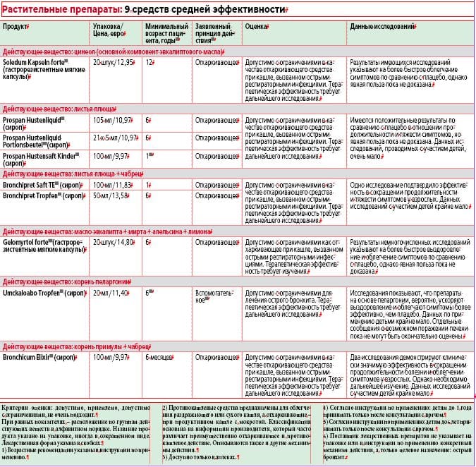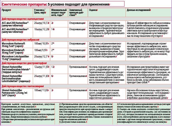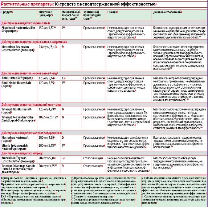 Эксперты не обнаружили убедительных доказательств эффективности действующих веществ в продуктах известных брендов, таких как Abtei, Klosterfrau, Tetesept, Silomat с пентоксиверином. Мы оцениваем их как «не очень подходящие».