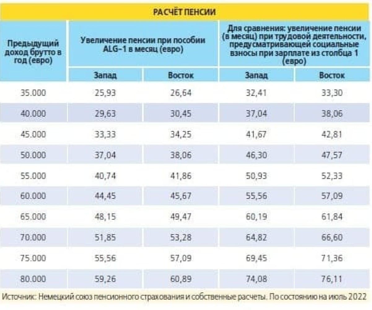 Пособие ALG 1 повышает пенсионные выплаты. Это связано с тем, что агентство по трудоустройству также платит взносы в фонд пенсионного страхования. Взнос рассчитывается из 80% вашей последней заработной платы брутто. Таким образом, вы имеете право на более низкую пенсию при получении ALG 1, чем если бы продолжали работать. Как конкретно такой подход влияет на разные классы заработной платы, показано в таблице «Расчёт пенсии». При получении социального пособия (ранее – ALG 2, теперь – Bürgergeld) агентство по трудоустройству с 2011 года перестало делать отчисления в фонд пенсионного страхования.