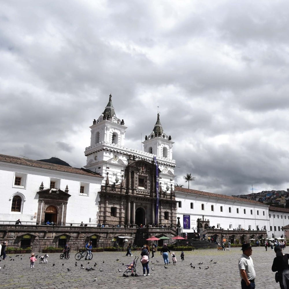 Затем мы отправились на большую площадь – Сан-Франциско. Здесь было шумно и многолюдно. И огромный древний собор, тоже именуемый Сан-Франциско, был полон прихожан и поражал своим великолепием и богатством позолоты. Кстати, этот собор является одним из старейших зданий Эквадора: его начали строить на фундаменте разрушенного дворца инков сразу после захвата города испанцами. В XVI веке именно здесь открылась художественная школа (знаменитая «школа Кито»), где монахи-францисканцы обучали детей рисованию, вышиванию, камнетесному делу. Впоследствии отсюда вышли многие знаменитые живописцы и скульпторы. Нам повезло взобраться и на крышу собора, чтобы полюбоваться городом с высоты и даже слегка ужаснуться большой свинцовой туче, которая стремилась обрушиться на Кито экваториальным ливнем, но зацепилась за вершину вулкана. А вскоре мы оказались в самом центре города – на площади Независимости (также известной как Plaza Grande). Площадь находится в окружении четырех важных и представительных зданий: Президентского дворца, Дворца архиепископа, Кафедрального собора Кито и Городского дворца. Украшает площадь монумент Независимости: на колонне возвышается богиня Свободы, а у ее ног лежит раненый лев, олицетворяющий испанские войска.