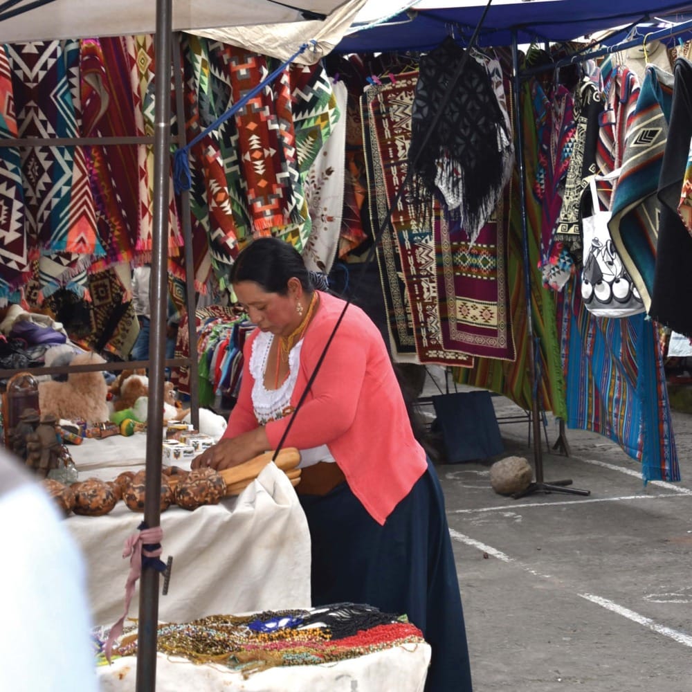 Мы отправились в городок Отавало, расположенный у подножия вулкана Имбабура. Местные рынки недаром считаются самыми известными в Южной Америке – от разнообразия товаров просто голова идет кругом. Вначале мы зашли на продуктовый рынок, потом – на ремесленный, расположившийся на главной площади города Пласа-делос-Пончос. Покупателей в этот будний день оказалось немного (особый наплыв наблюдается здесь по субботам), зато чего здесь только не предлагали! Яркие вязаные изделия, сувениры из дерева, пончо из шерсти альпаки, украшения, коврики и сумки, музыкальные инструменты...