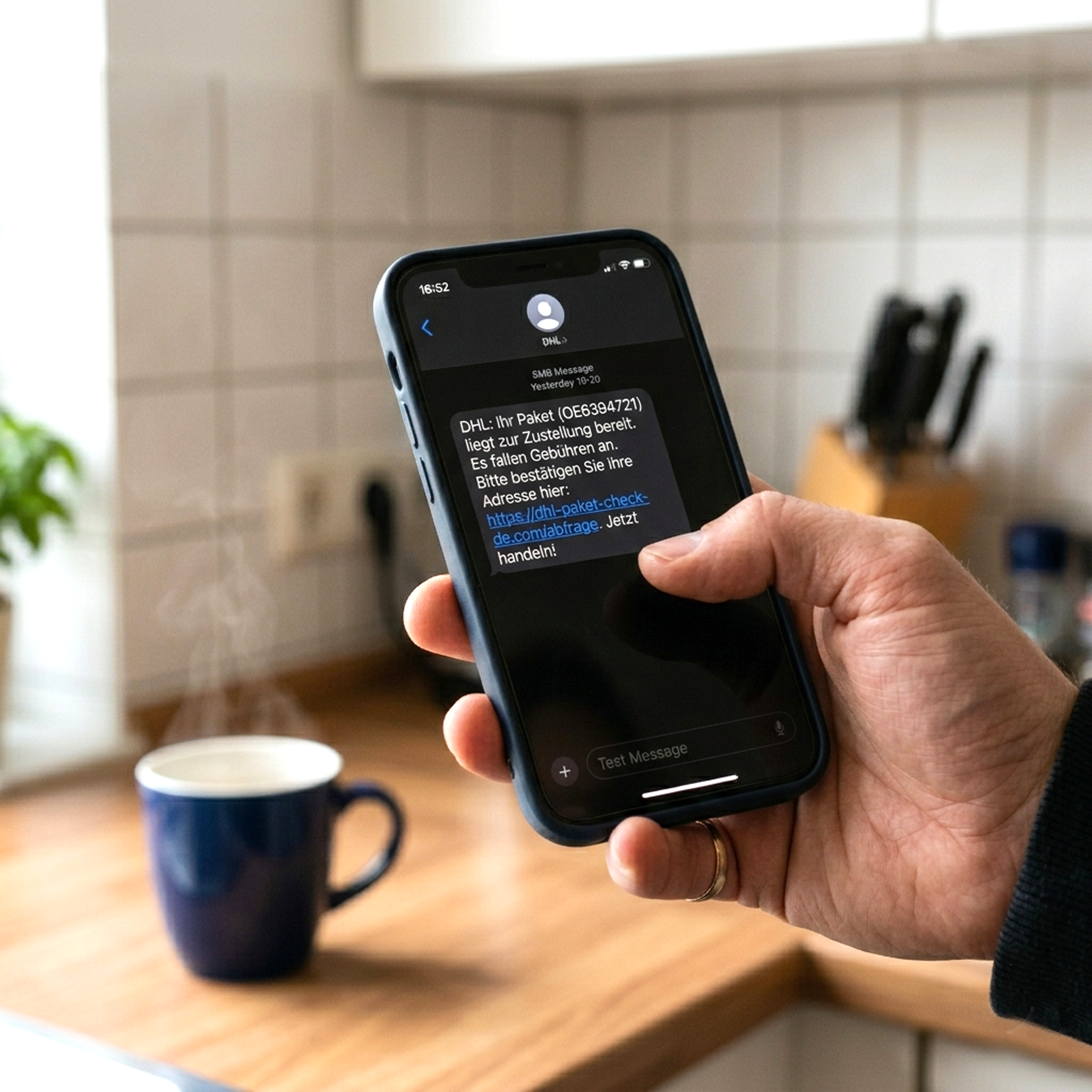 Федеральное сетевое агентство Германии (Bundesnetzagentur) ежегодно получает тысячи жалоб на мошеннические SMS. Только в 2024 году поступило более 11.400 обращений. Схема всегда одна: SMS о «задержке» посылки или «таможенном сборе» – и ссылка на страницу, внешне идентичную сайту DHL. Там предлагают ввести данные карты. В этот момент и происходит кража.