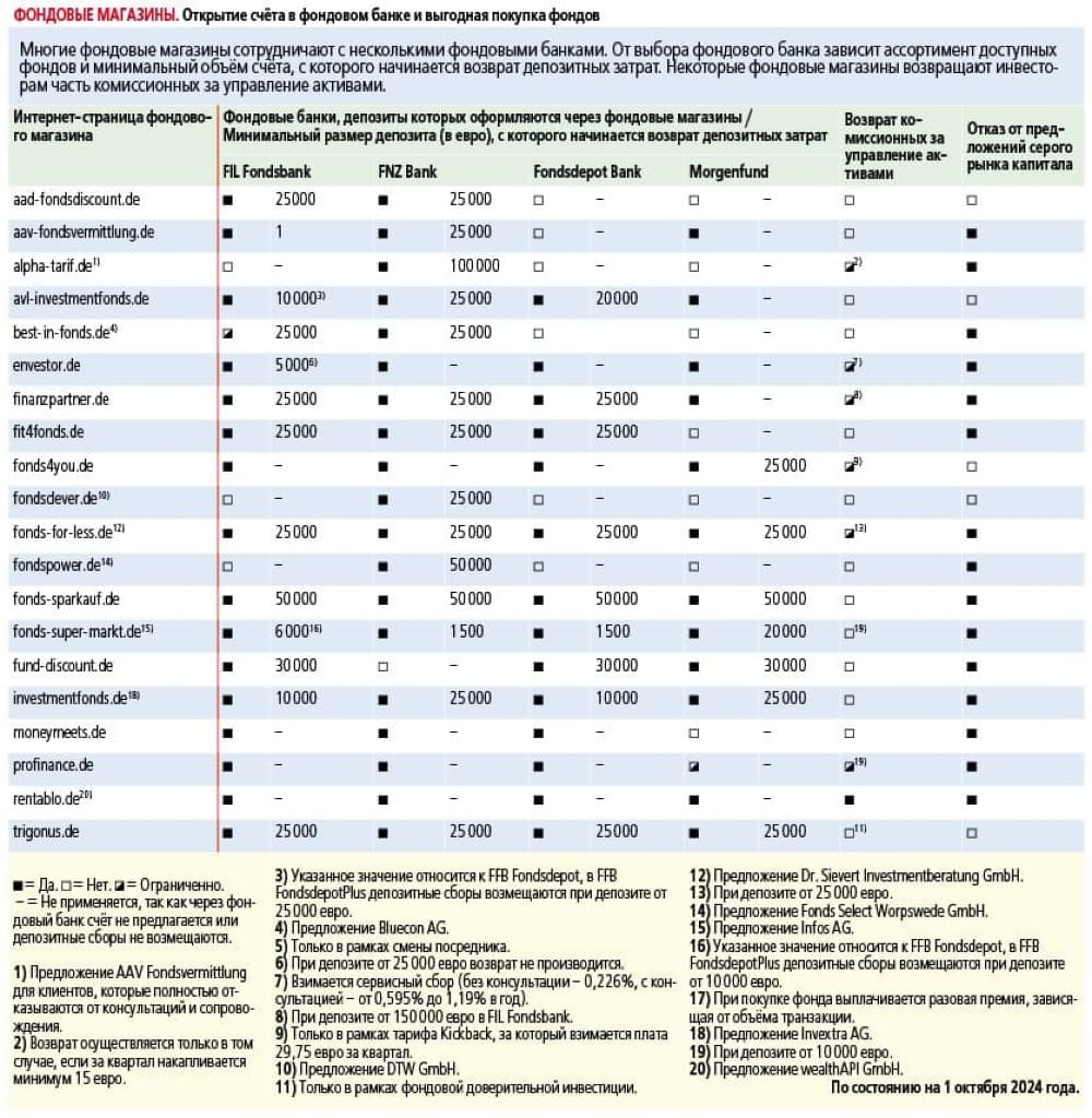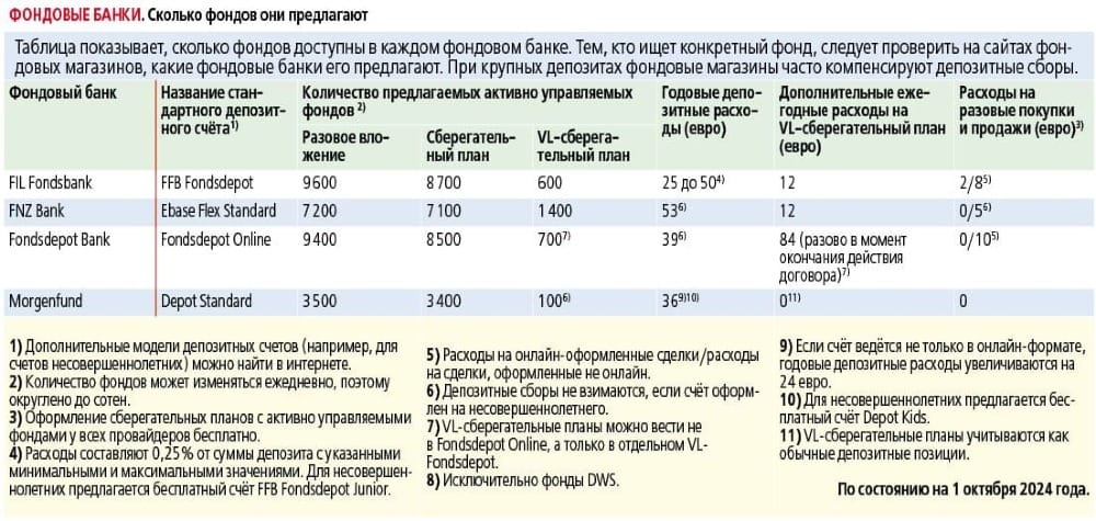 Таблица фондовых банков показывает, что количество доступных фондов значительно различается. Например, Morgenfund предлагает «всего» 3.500 фондов для единовременных инвестиций, тогда как FIL Fondsbank и Fondsdepot Bank имеют в своем ассортименте более 9.000 фондов.
