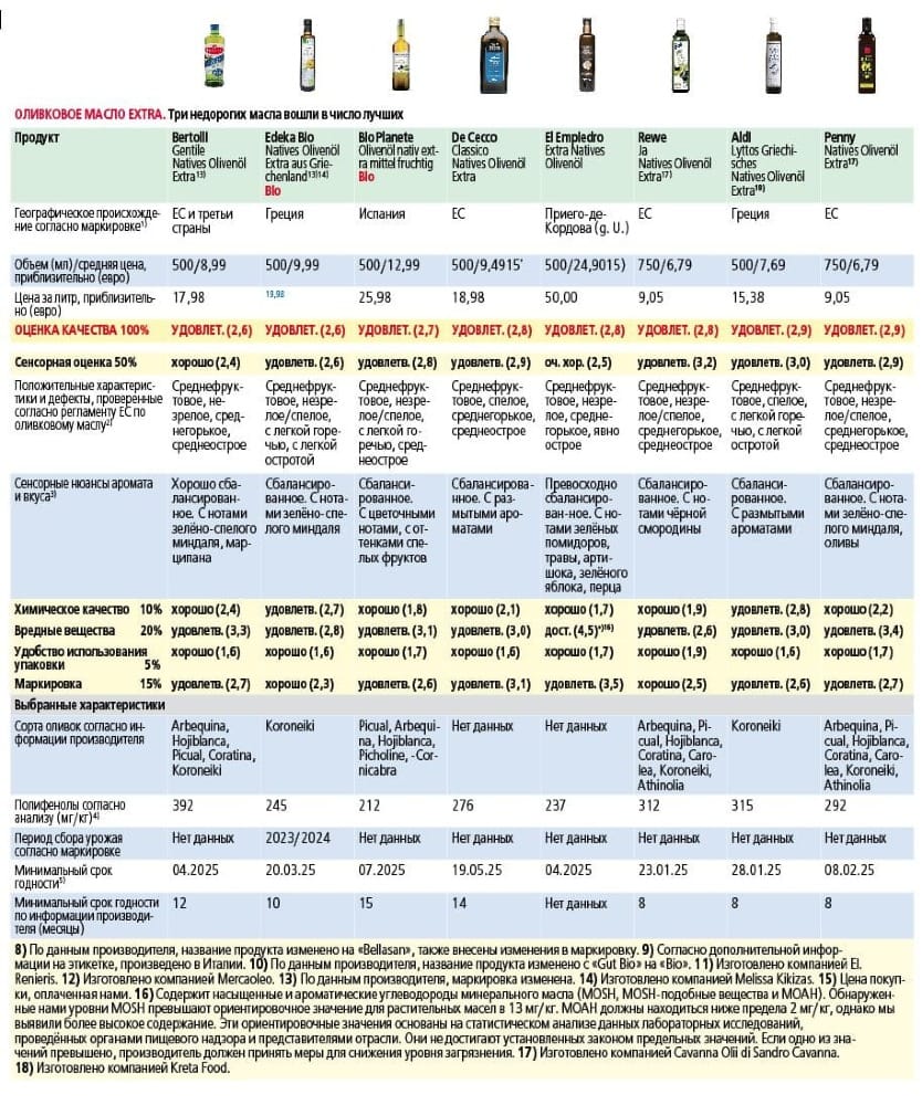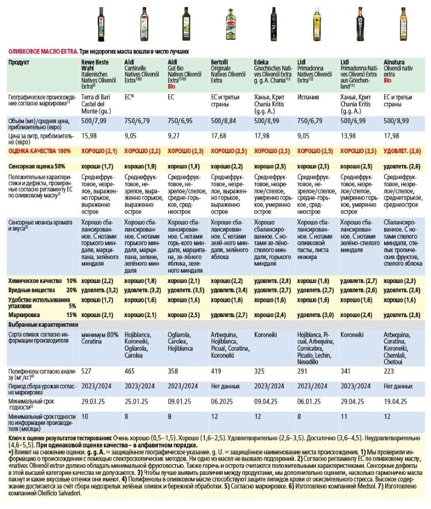 Эксперты отмечают, что показатели свежести масла стали хуже, чем в прежние годы. Содержание полифенолов, полезных для здоровья, оказалось ниже среднего. Вероятная причина – тепловой стресс деревьев, который влияет и на вкус. Так масла Kaufland и Netto оказались несбалансированными и с размытыми ароматами. Торговые сети предлагают масла с защищённым географическим происхождением (например, Chania с Крита или Terra di Bari из Италии). Проверка показала: обозначения достоверны. Такие масла зачастую лучше по качеству, но дороже.