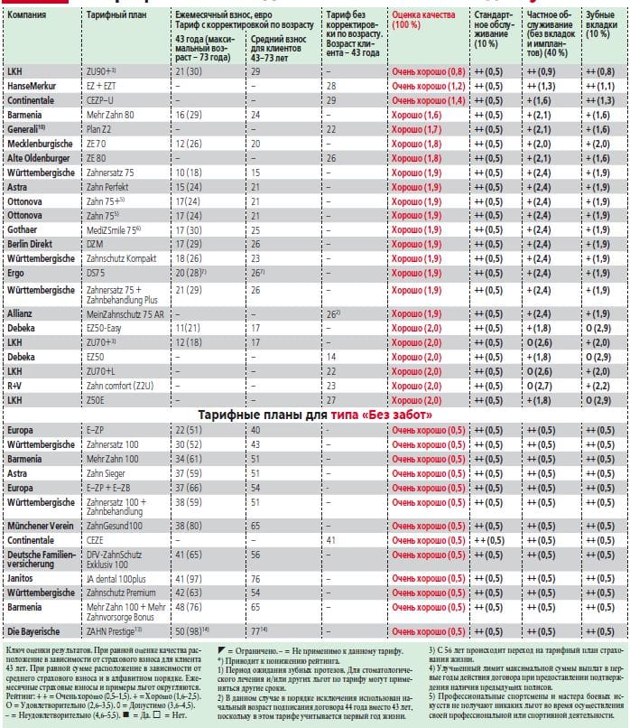 Большинство людей, конечно, стремится найти полис подешевле, который дает больше преимуществ. Лучший вариант для такого типа потребителей предлагает LKH. За пакет ZU90+ 43-летний клиент заплатит всего 21 евро в месяц, а при условии, что застрахованное лицо регулярно посещало стоматолога, можно рассчитывать на компенсацию импланта стоимостью до 4.847 евро и всех расходов на зубные коронки и вкладки. При заключении договора представитель компании проинформирует о том, что по мере увеличения возраста плата за пакет будет возрастать. (В таблице приведен средний взнос для клиентов 43–73 лет.) По достижении 56 лет клиент должен выбрать либо более дорогой полис, либо искать нового страховщика.