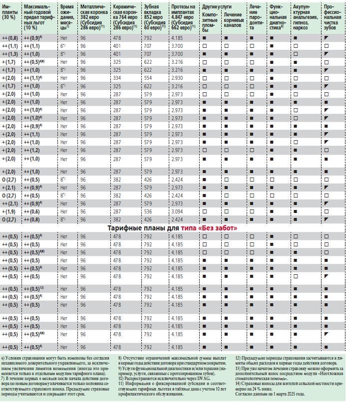 Тип «Без забот» является дорогим полисом, предлагающим самый широкий спектр услуг. При такой страховке клиенту не придется ничего доплачивать даже за дорогостоящие импланты (более 4.000 евро). Правда, для этого страховые взносы придется вносить немалые: 40–77 евро в месяц.